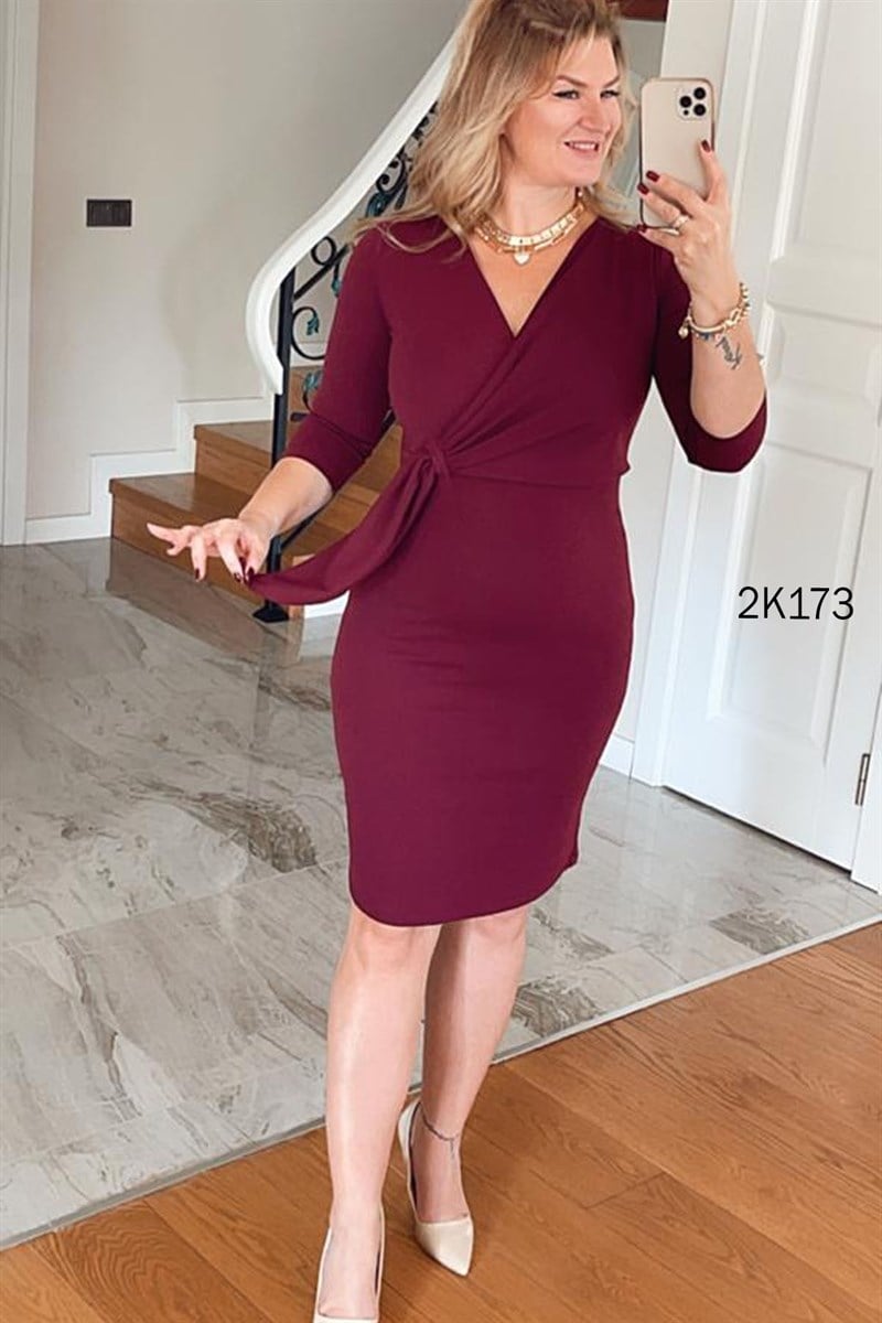 KRUVAZE YAKA LİKRALI KUMAŞ ELBİSE OMUZDAN AŞAĞI 97 CM