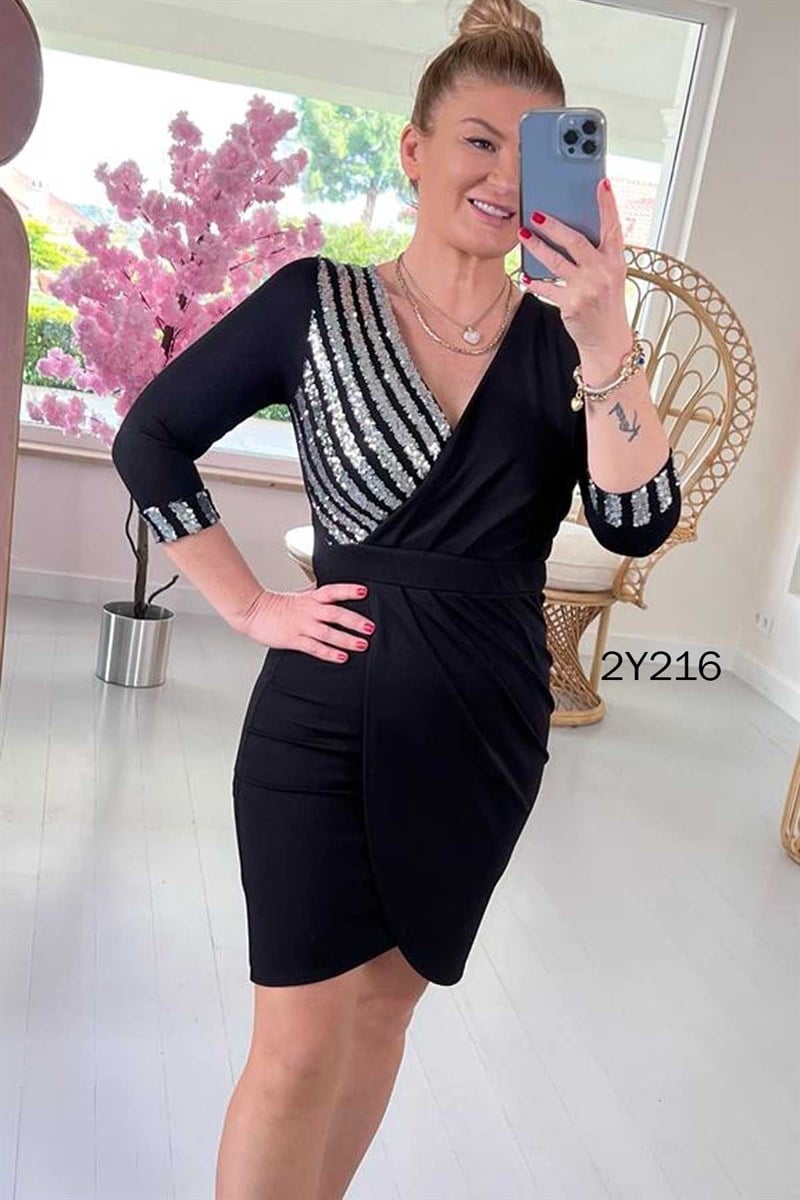 KRUVAZE YAKA PUL DETAY ELBİSE OMUZDAN AŞAĞI 92 CM