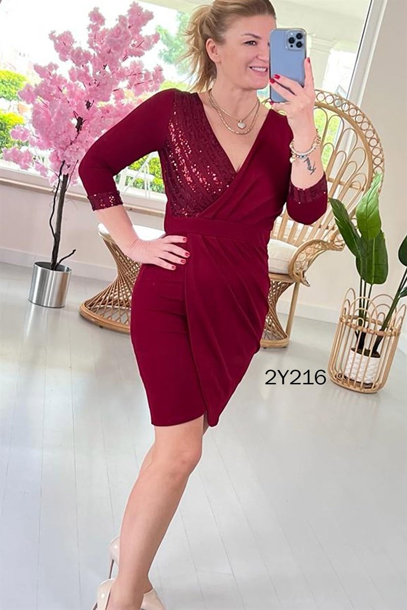 KRUVAZE YAKA PUL DETAY ELBİSE OMUZDAN AŞAĞI 92 CM