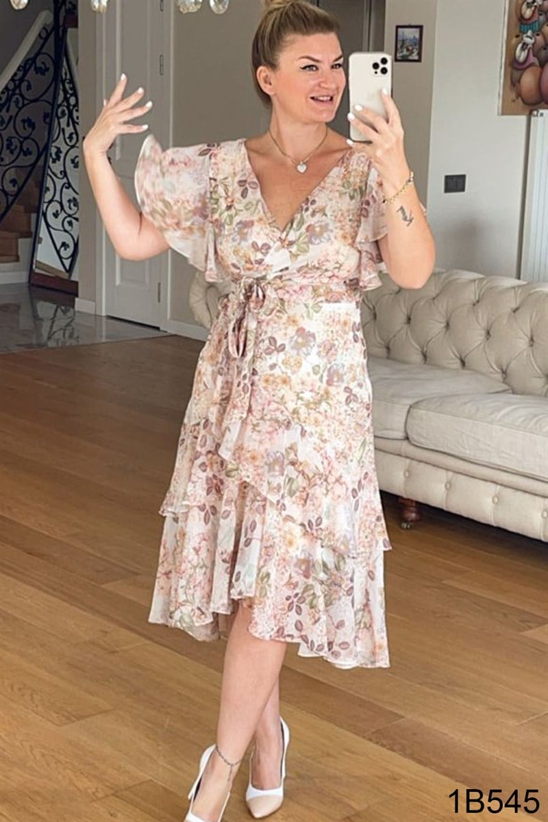 Kruvaze Yaka Volanlı Şifon Elbise