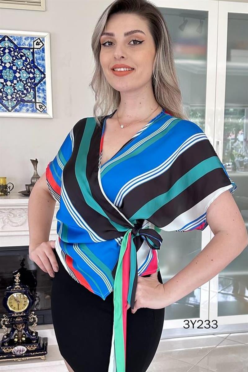 Kruvaze Yaka Yandan Bağlamalı Saten Bluz