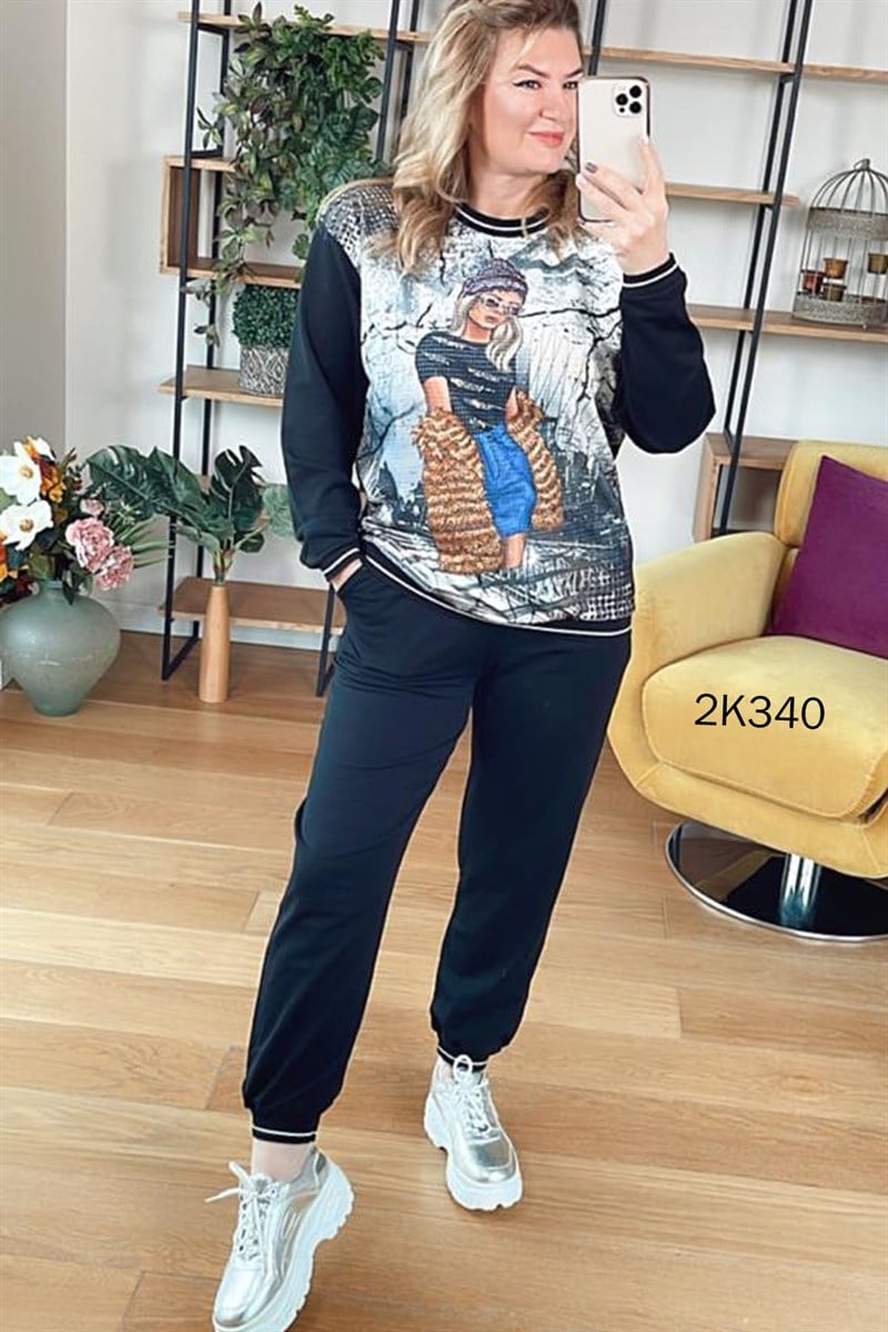 KÜRKLÜ KIZ BASKILI EŞOFMAN TAKIMI OMUZDAN AŞAĞI ÜST 70 CM ALT BELDEN AŞAĞI 95 CM