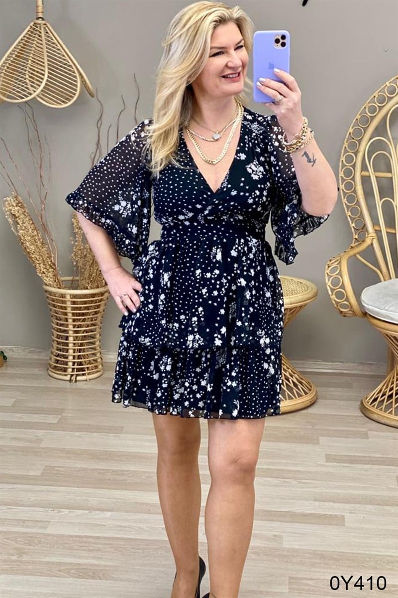 ASTARLI KURUVAZXE YAKA KISA KOL ETEK KAT DETAYLI ELBİSE.