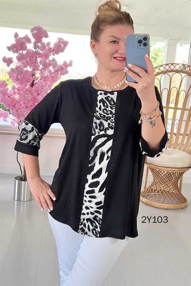 LEOPAR GARNİLİ TAŞ DETAY BLUZ OMUZDAN AŞAĞI 68 CM