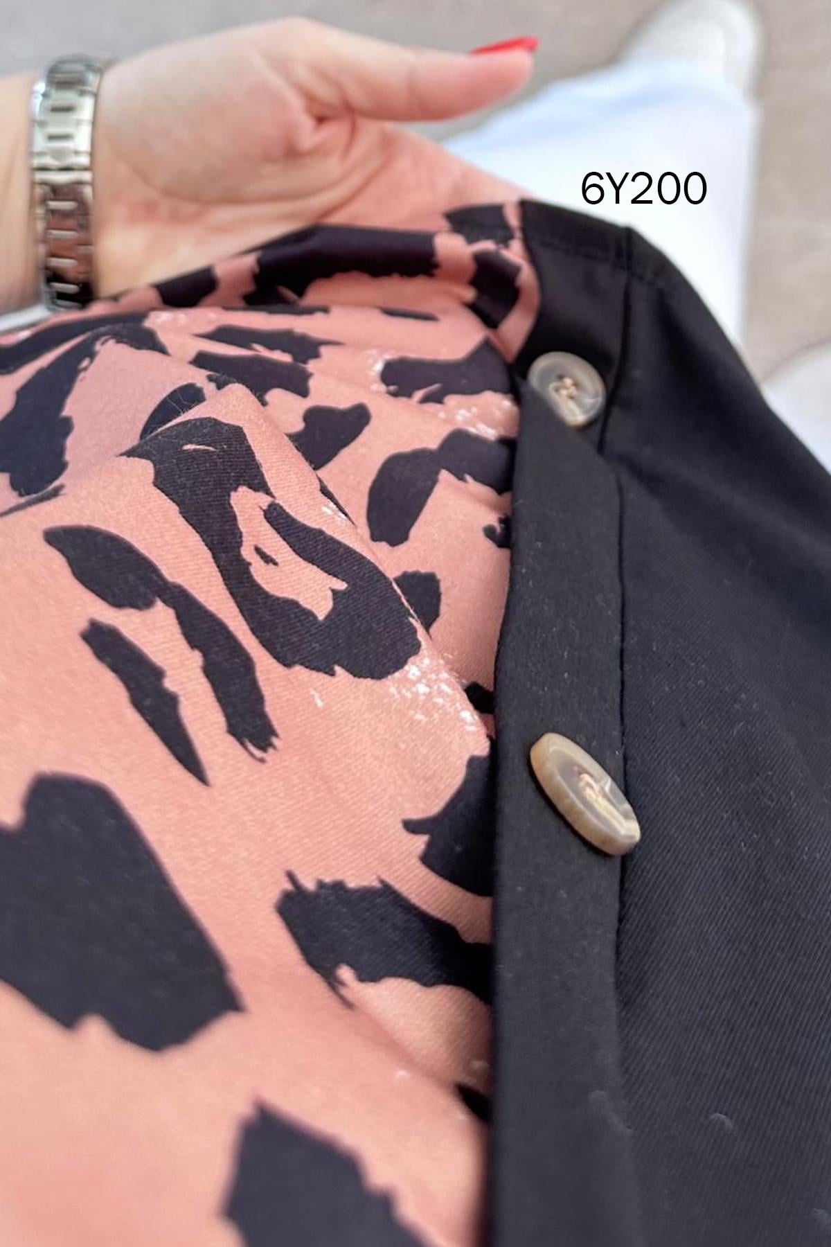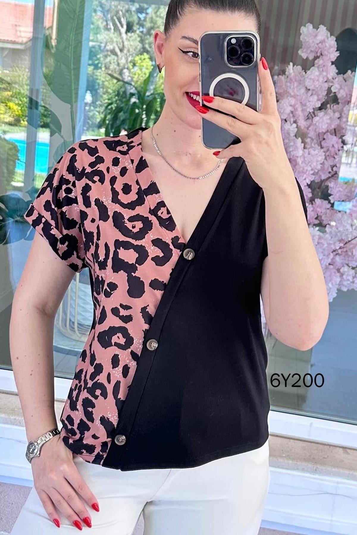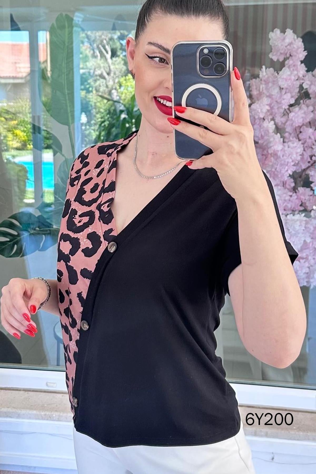 LEOPAR GARNİLİ VİSKON BLUZ OMUZDAN AŞAĞI 60CM