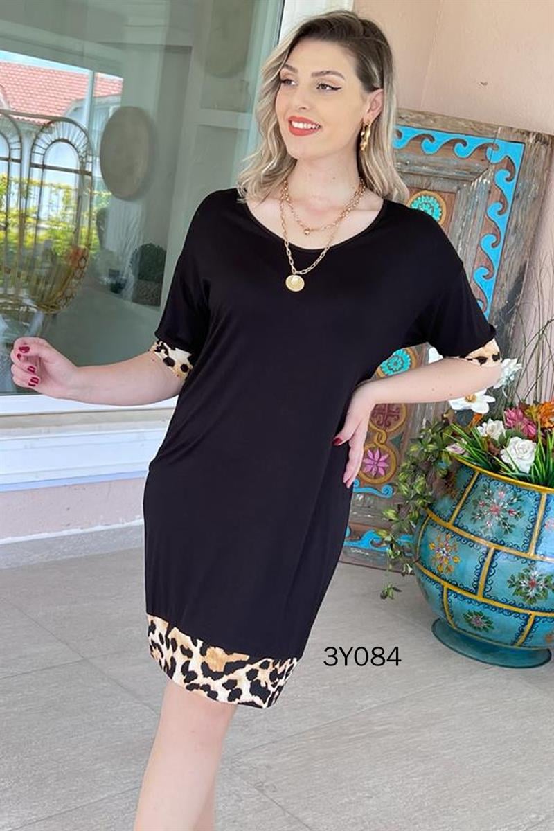 LEOPAR GARNİLİ VİSKON ELBİSE OMUZDAN AŞAĞI 96 CM