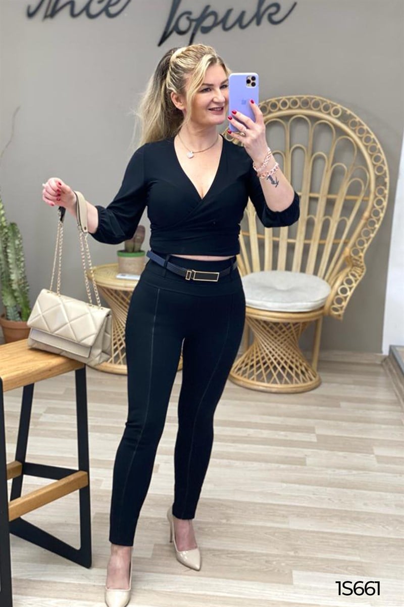 Likralı Deri Şeritli Arkadan Cepli Tayt