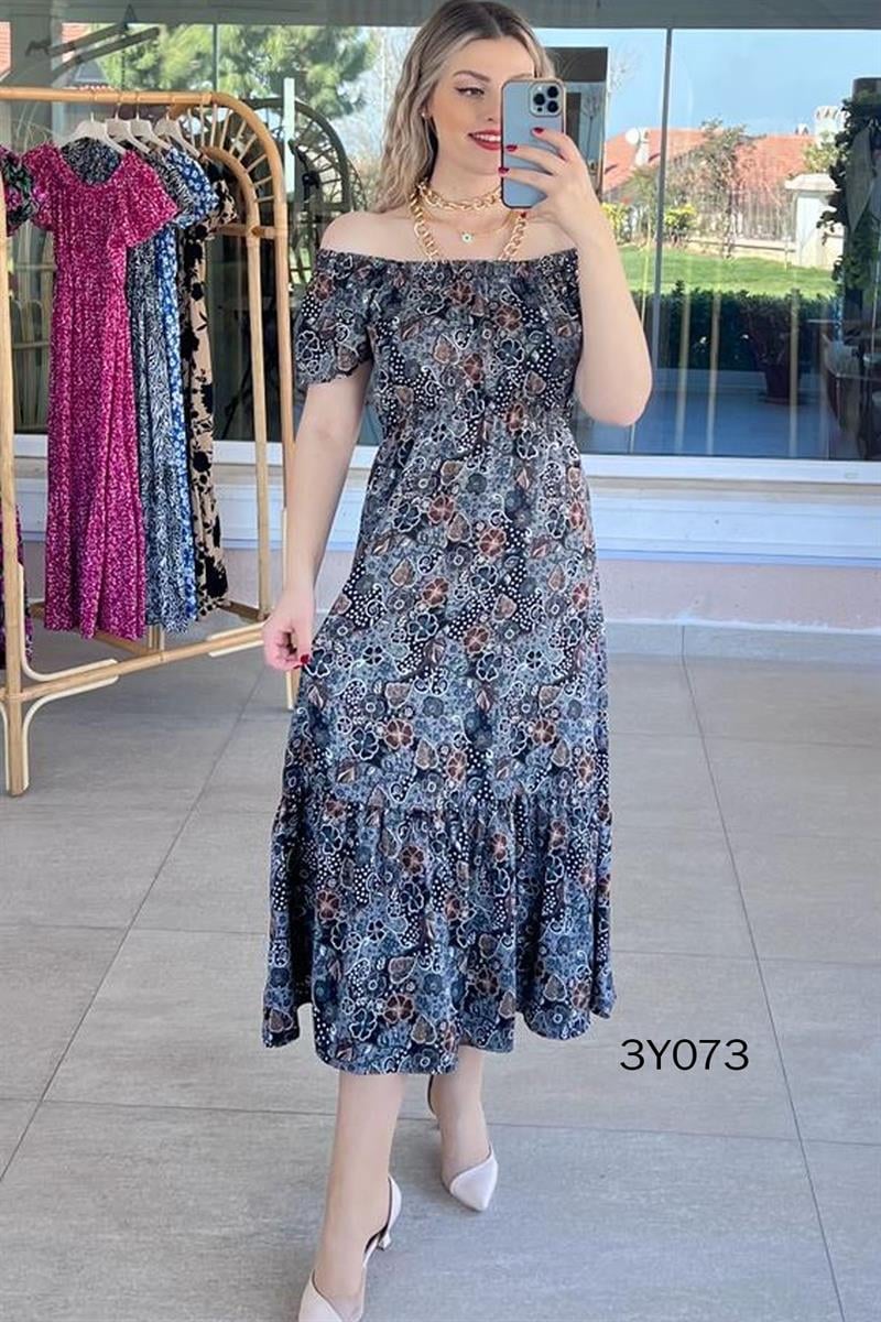 MADONNA YAKA BELİ LASTİKLİ VİSKON ELBİSE OMUZDAN AŞAĞI 120 CM
