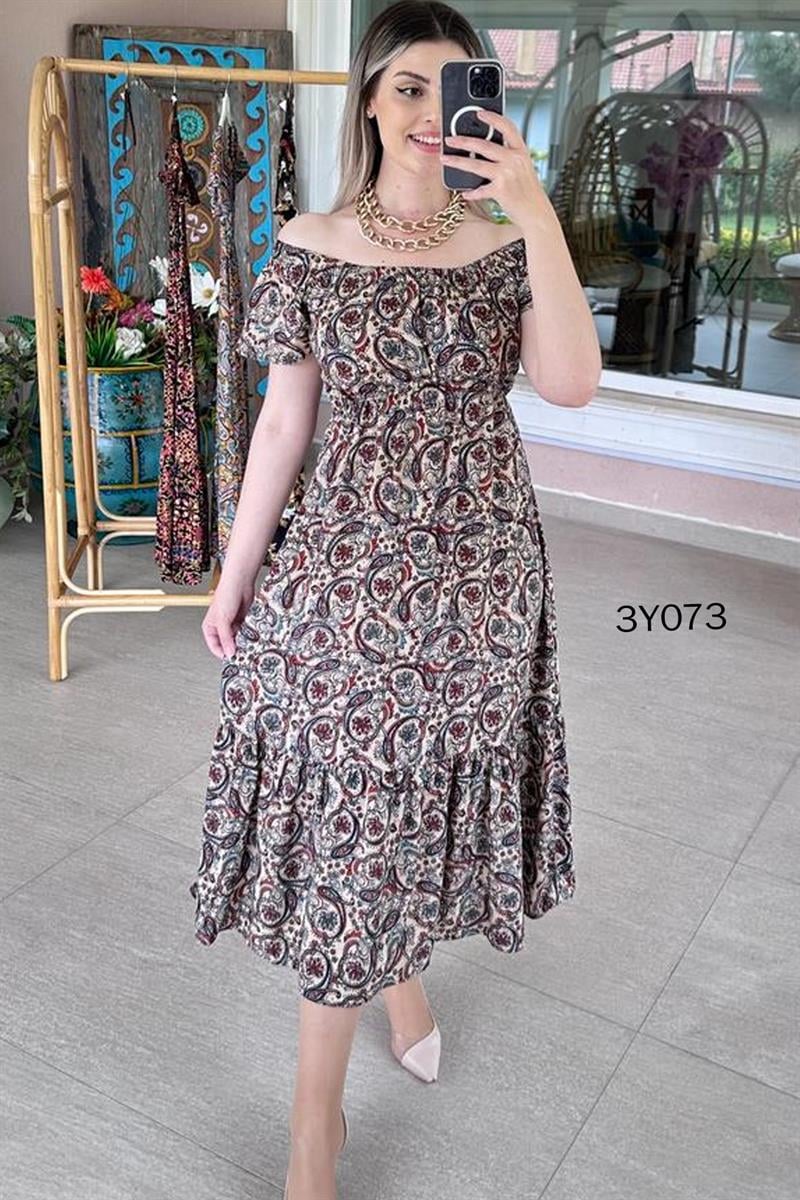 MADONNA YAKA BELİ LASTİKLİ VİSKON ELBİSE OMUZDAN AŞAĞI 120 CM
