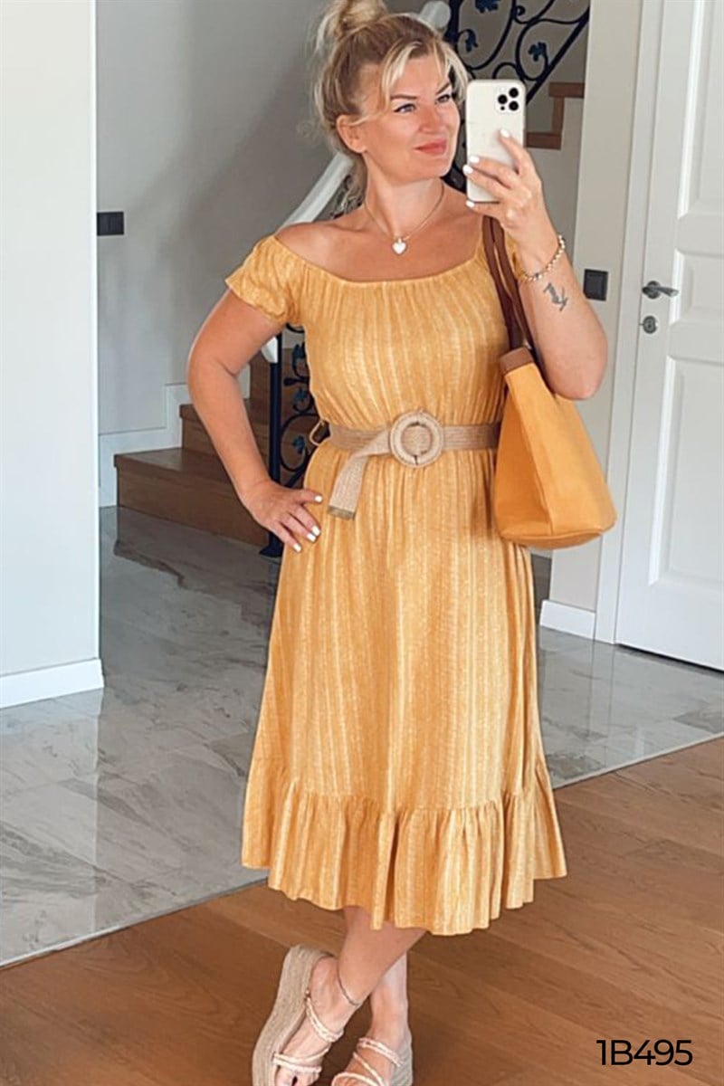 MADONNA YAKA HASIR KEMERLİ ELBİSE OMUZDAN AŞAĞI 105 CM