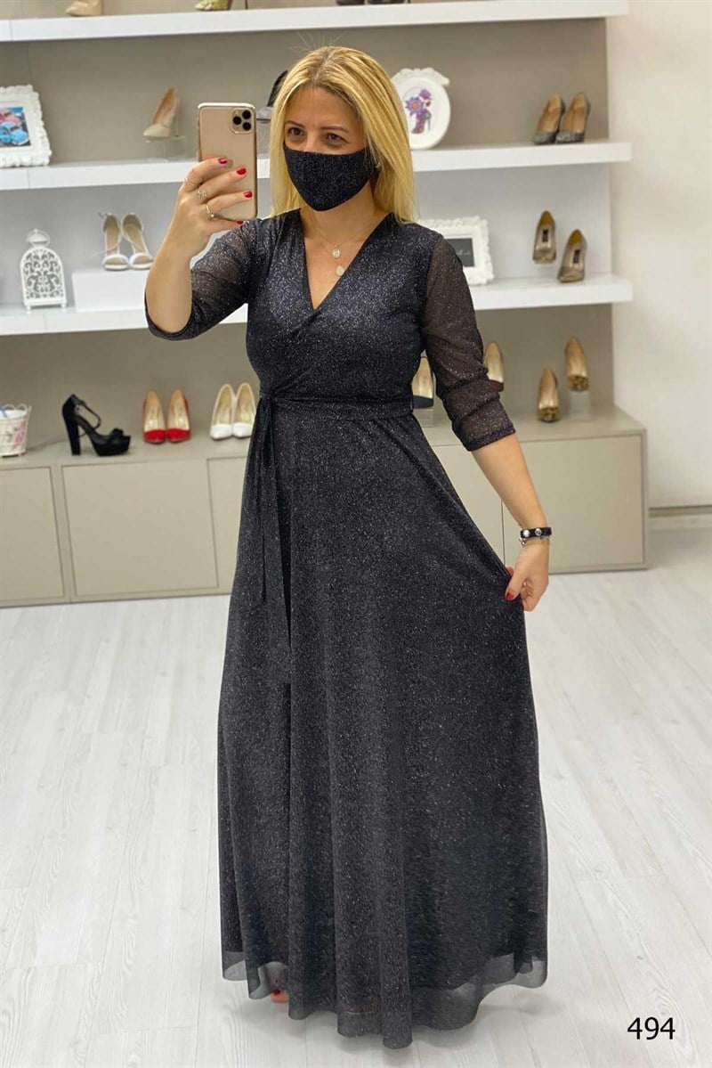 KURUVAZE YAKA YARIM KOL SİMLİ BELİ BAĞLAMALI MASKE HEDİYELİ TAM BOY ELBİSE
