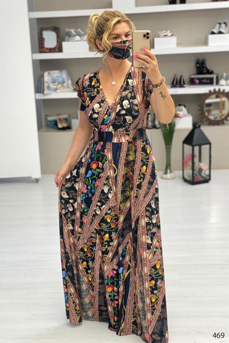MASKE HEDİYELİ VOLAN KOL V YAKA BELİ KEMERLİ DESENLİ TAM BOY ELBİSE