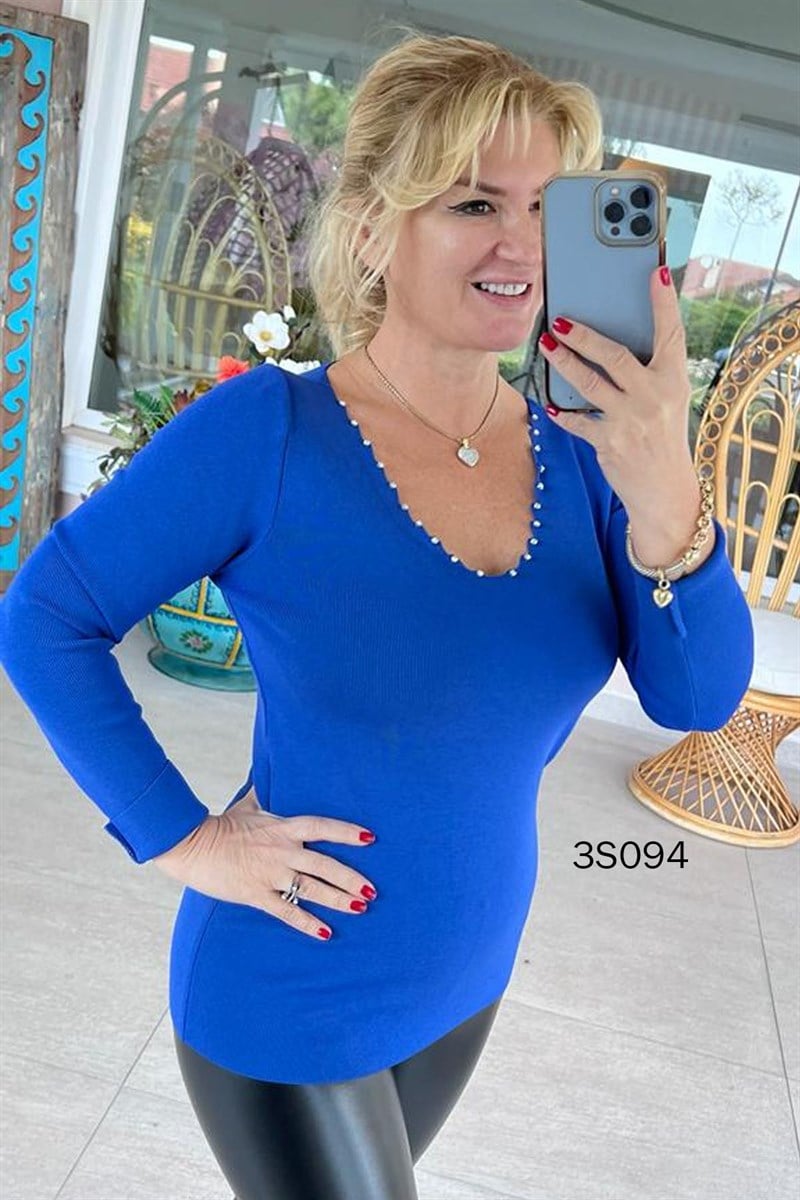 MERDİVEN YAKA TAŞ İŞLEMELİ TRİKO BLUZ OMUZDAN AŞAĞI 65 CM Ürünümüz çelik trikodur.