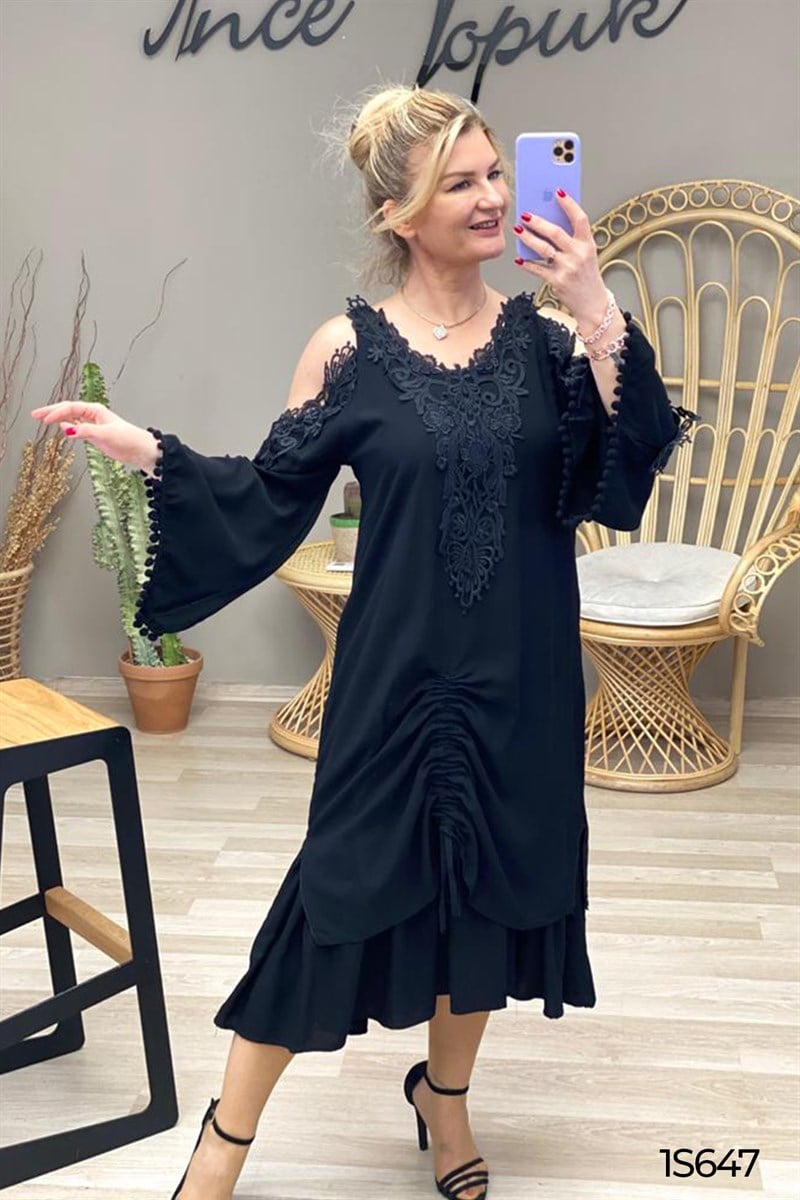 OMUZ DEKOLTE DANTEL DETAY ELBİSE OMUZDAN AŞAĞI 112 CM