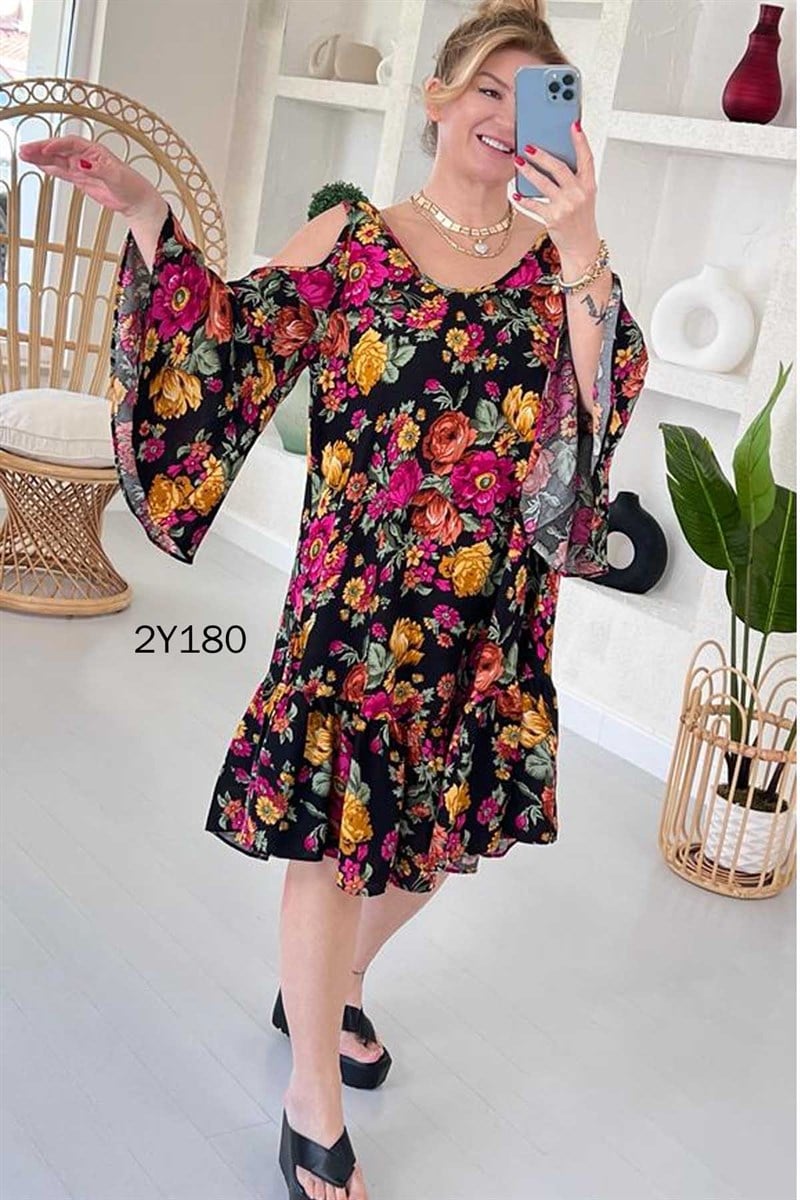 OMUZ DEKOLTE FIRFIRLI ELBİSE OMUZDAN AŞAĞI 103 CM