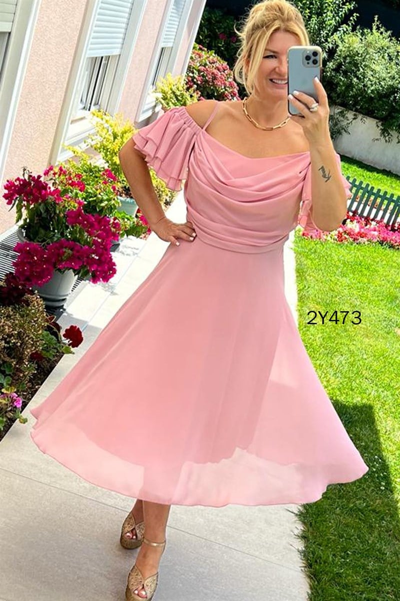 OMUZ DEKOLTE ŞİFON ELBİSE OMUZDAN AŞAĞI 113 CM