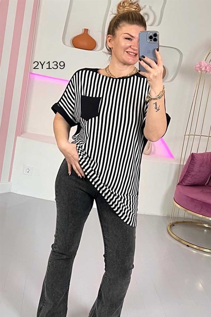 ÖNDEN CEP DETAY ÇİZGİLİ BLUZ OMUZDAN AŞAĞI 80 CM