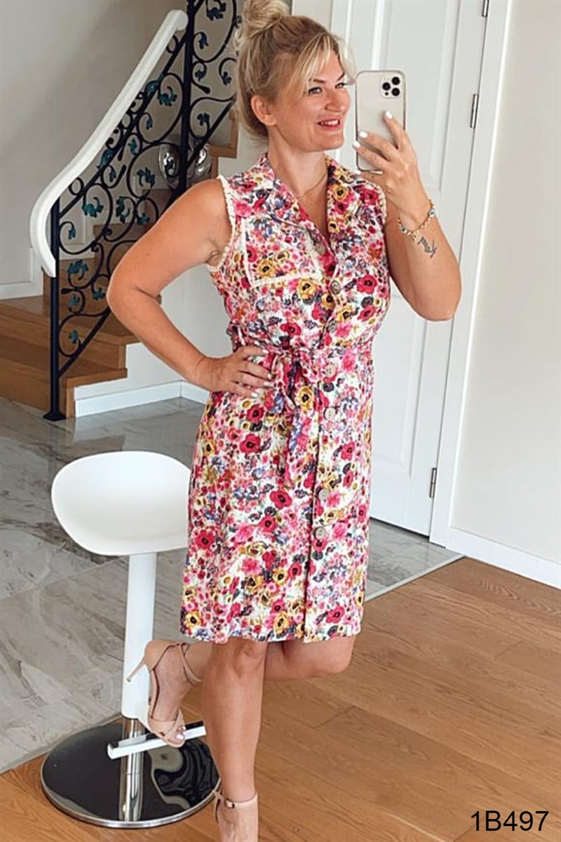 ÖNDEN DÜĞMELİ KETEN ELBİSE OMUZDAN AŞAĞI 95 CM
