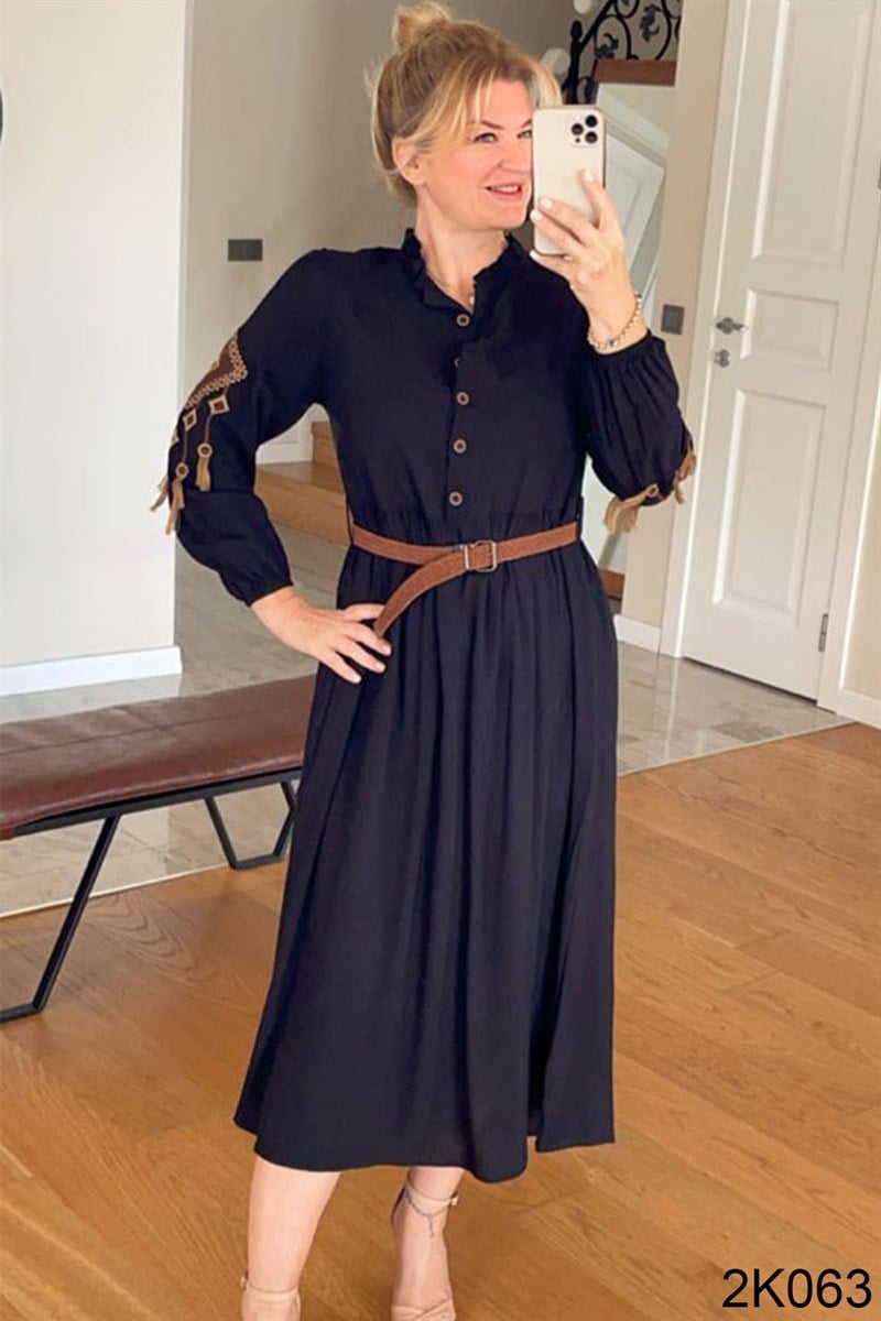 Önden Düğmeli Nakışlı Elbise