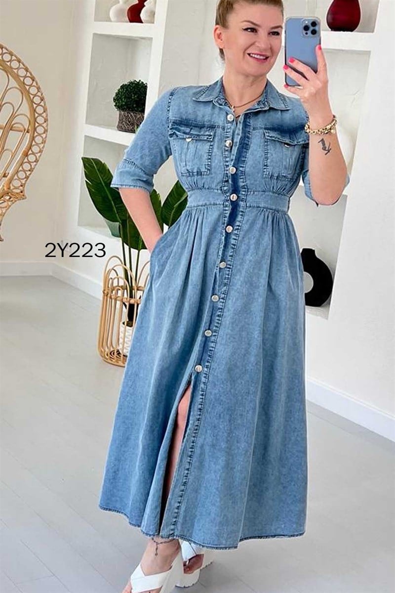 METAL DÜĞMELİ KOT ELBİSE OMUZDAN AŞAĞI 132 CM