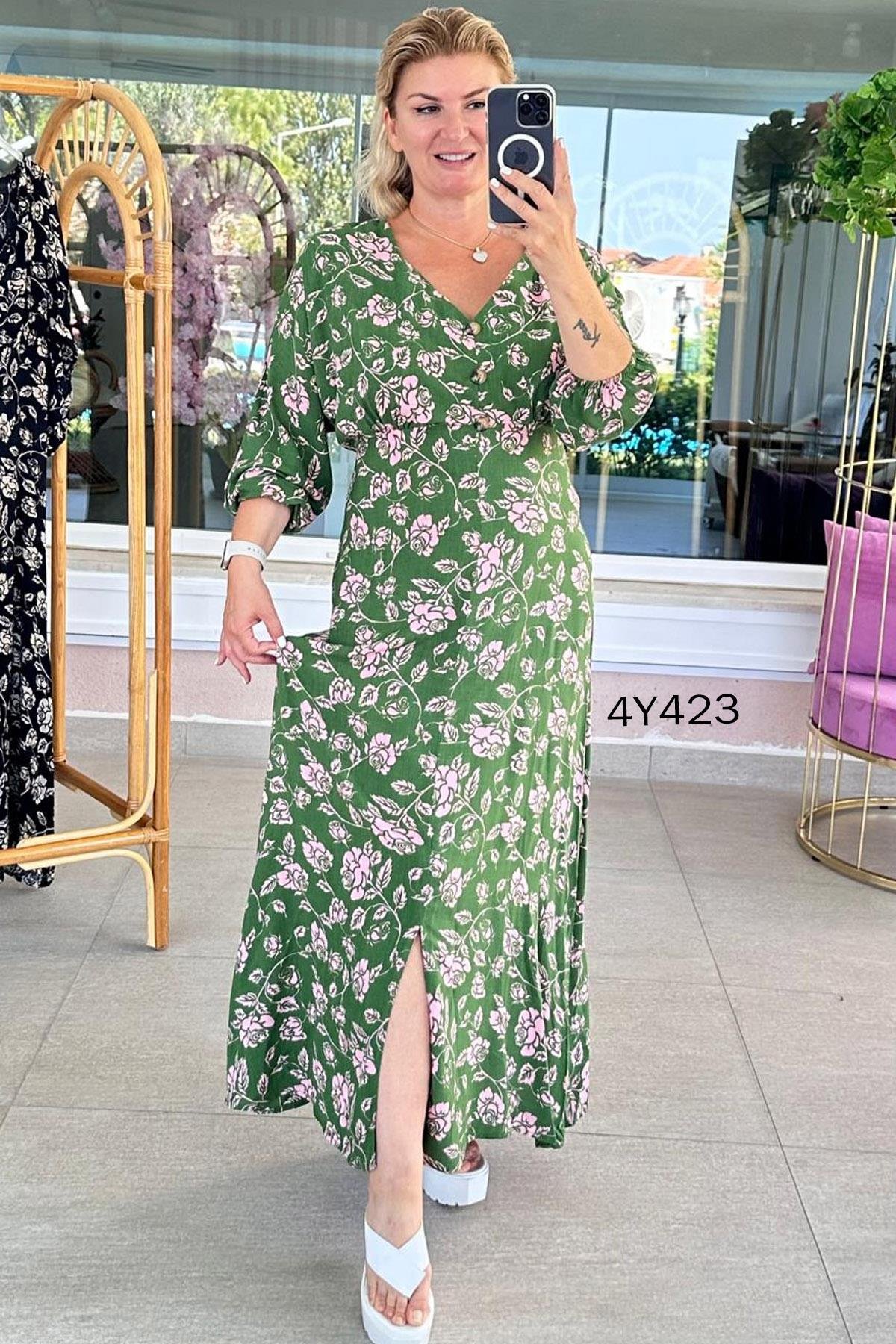 ÖNÜ DÜĞMELİ YIRTMAÇLI VİSKON ELBİSE OMUZDAN AŞAĞI 133 CM