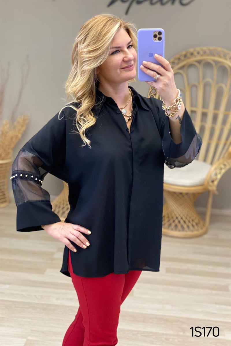 KOL ORGANZE DETAY İNCİLİ BLUZ OMUZDAN AŞAĞI 75 CM