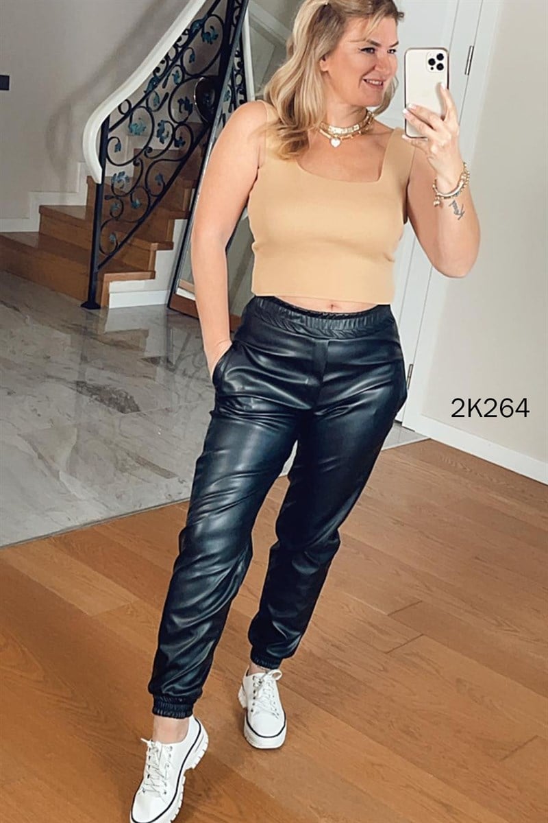 Paçası Lastikli Deri Pantolon