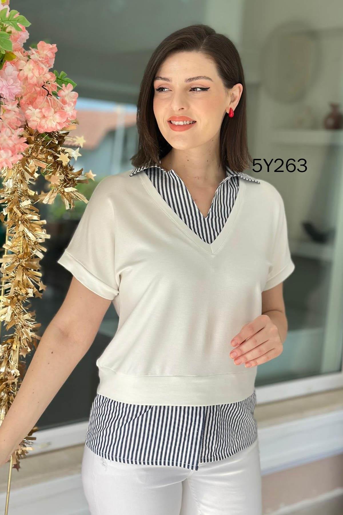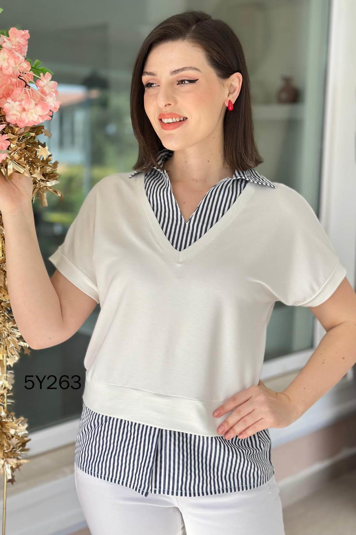 POPLİN GARNİLİ KRİSTAL BLUZ OMUZDAN AŞAĞI 66 CM