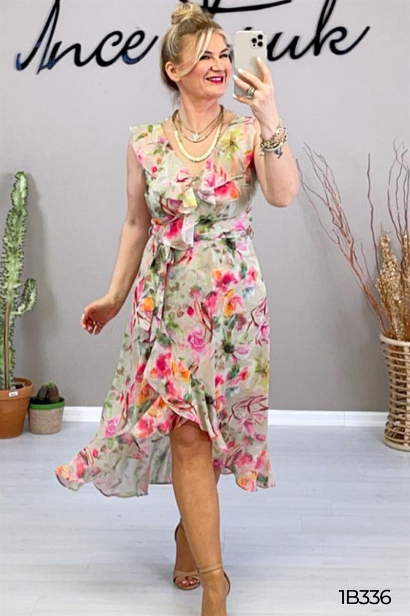Sıfır Kol Desenli Şifon Elbise