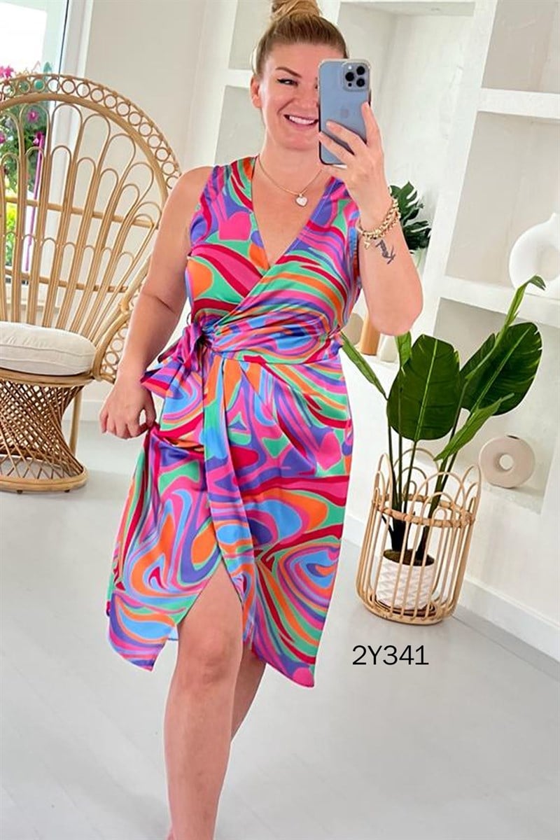 Sıfır Kol Kruvaze Yaka Yandan Bağlamalı Elbise
