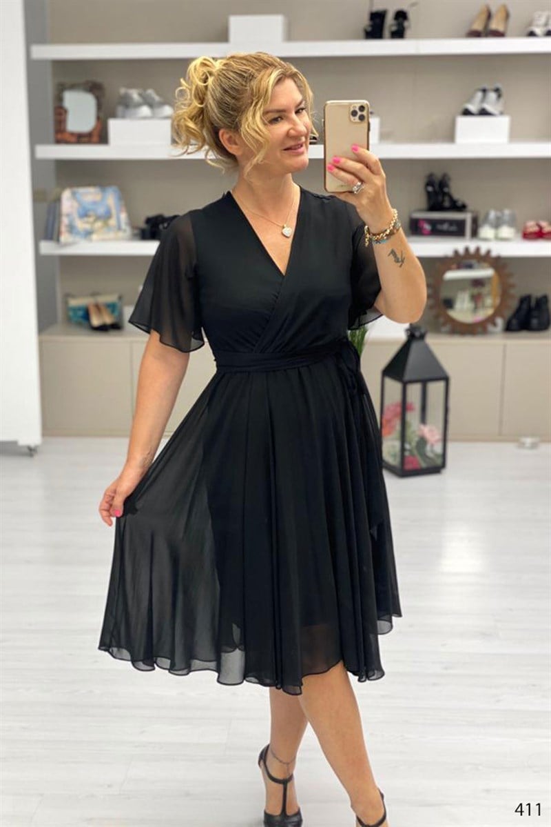 KRUVAZE YAKA KISA KOLLU İÇ KESİMİ ASTARLI BELDEN KEMERLİ KİLOŞ ETEK NORMAL KALIP ELBİSE MODELİDİR ŞİFON OMUZDAN AŞAGIYA 103 CM DİR