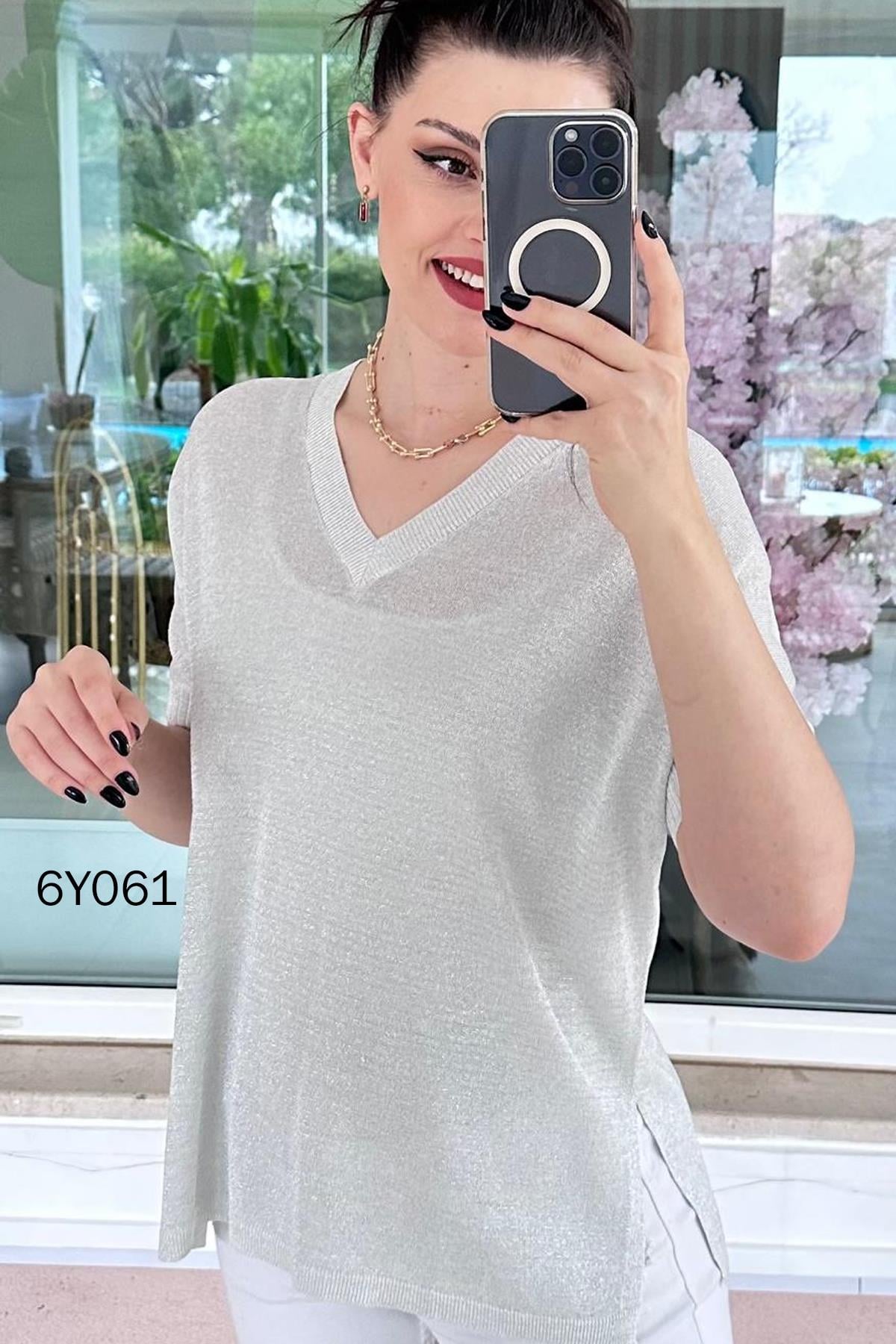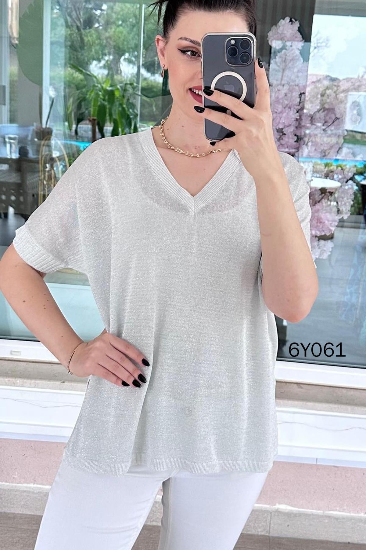 Simli V Yaka Merserize Triko Bluz (6Y0612939036)