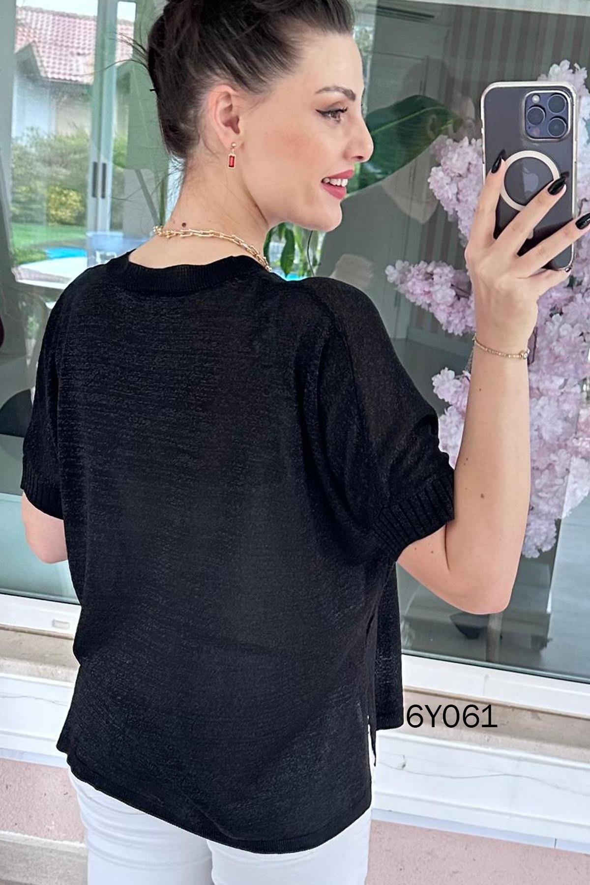 SİMLİ V YAKA MERSERİZE TRİKO BLUZ OMUZDAN AŞAĞI 65 CM Ürünümüz trikodur. Full likralı, standart bedendir. 38-46 beden arası tavsiye edilir.