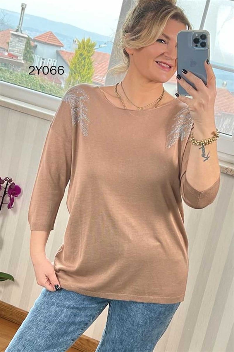 SİMLİ YAPRAK İŞLEMELİ TRİKO BLUZ OMUZDAN AŞAĞI 67 CM