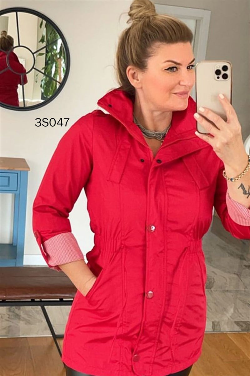 ÖNÜ FERMUARLI KOL KATLAMALI SU GEÇİRMEZ TRENÇKOT 30 C YIKAMA OMUZDAN AŞAĞI ÖN 77 CM ARKA 85 CM