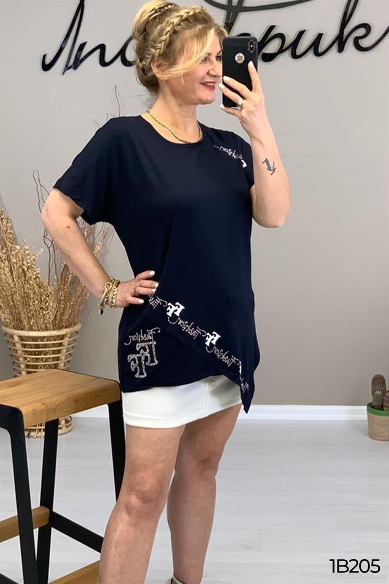 TAŞ BASKILI ASİMETRİK BLUZ OMUZDAN AŞAĞI 80 CM BEDEN ARALIĞI =ML-XL2XL