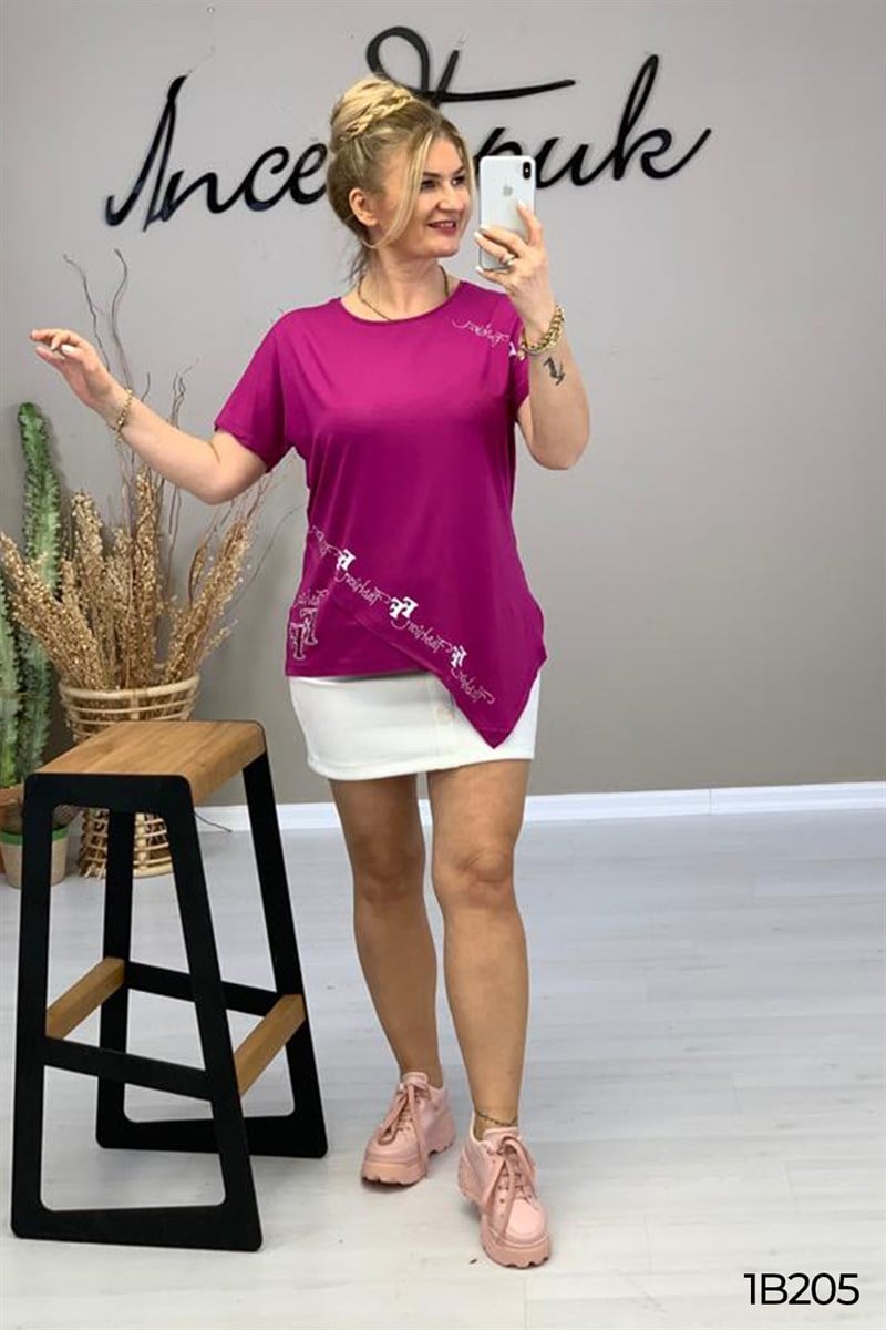 TAŞ BASKILI ASİMETRİK BLUZ OMUZDAN AŞAĞI 80 CM BEDEN ARALIĞI =ML-XL2XL