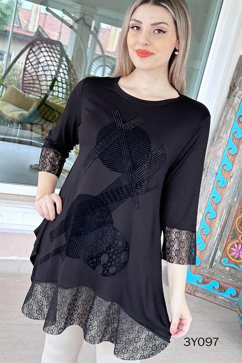 TAŞ BASKILI DANTEL DETAY VİSKON BLUZ OMUZDAN AŞAĞI 87 CM