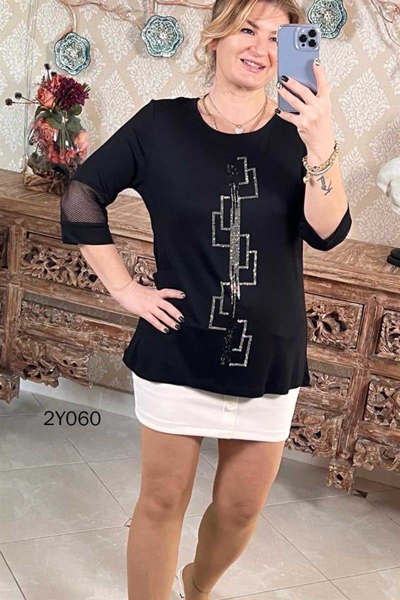 Taş Detay Kolları Fileli Likralı Bluz