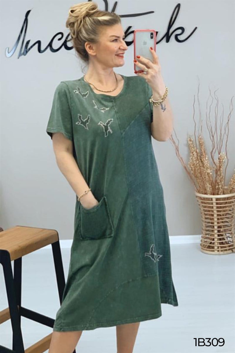 TAŞ DETAY ÖNDEN CEPLİ ELBİSE OMUZDAN AŞAĞI 110 CM