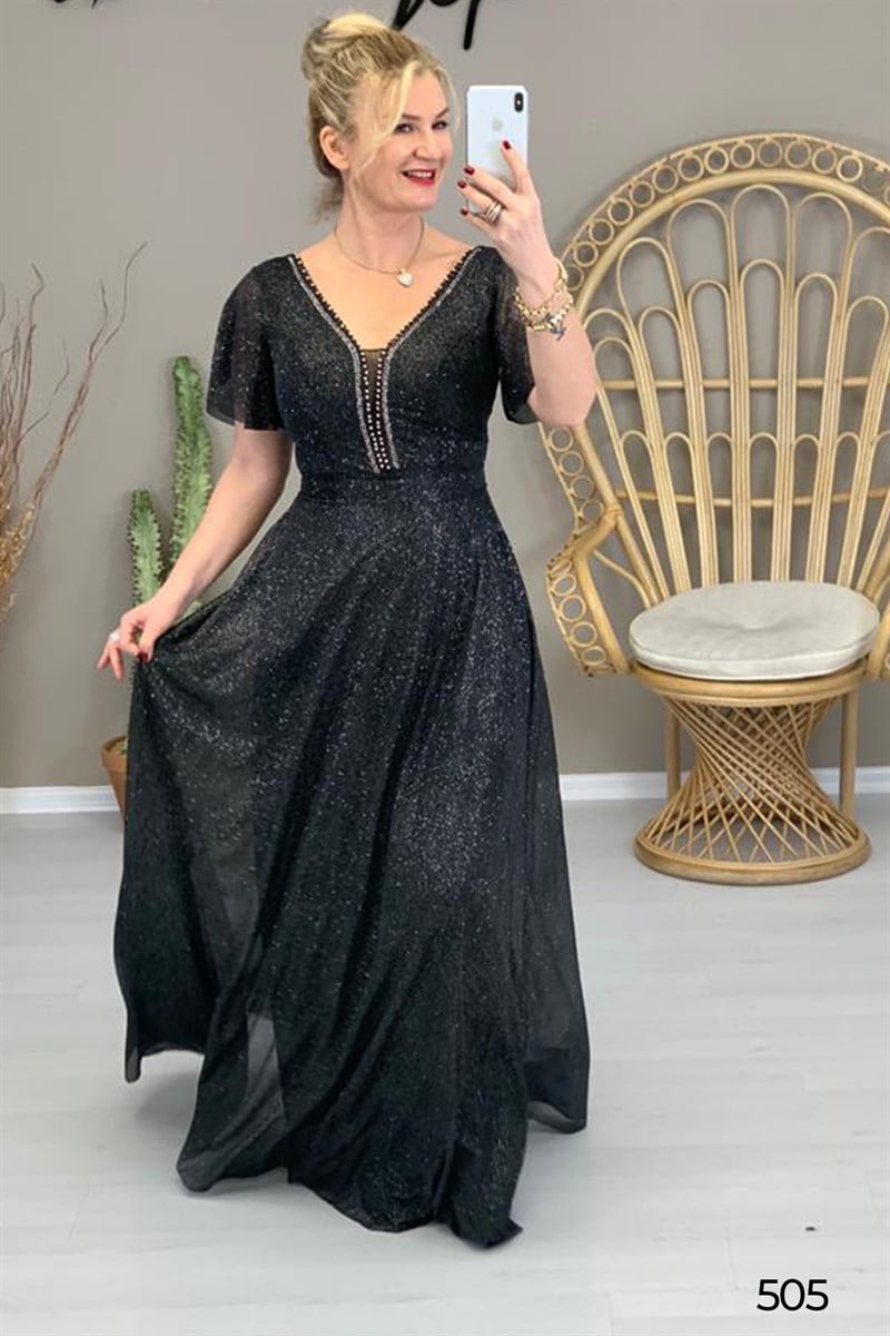 KISA KOL SİMLİ YAKA TAŞ İŞLEMELİ ÖN ARKA V YAKA ASTARLI TAM BOY ELBİSE
