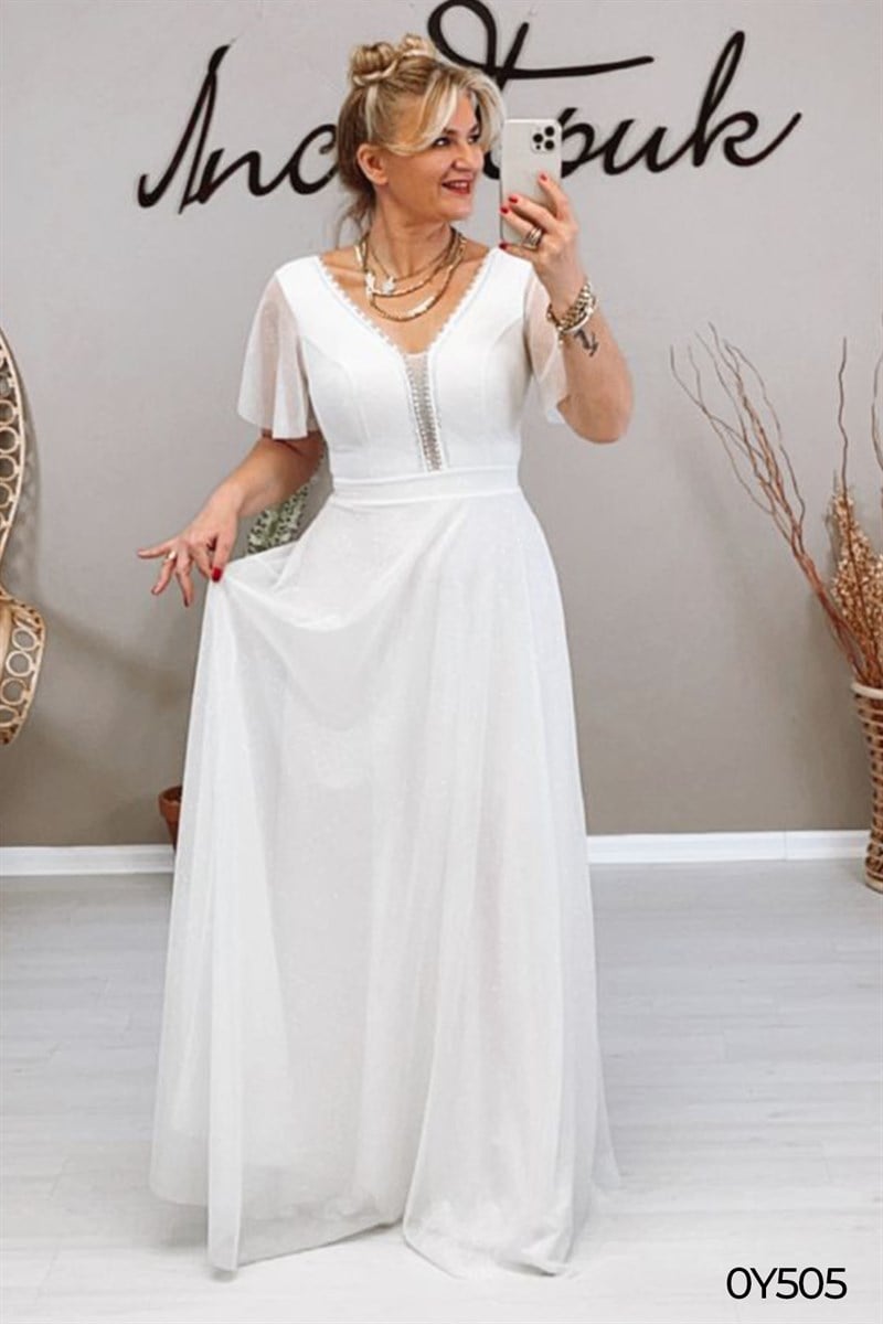 KISA KOL SİMLİ YAKA TAŞ İŞLEMELİ ÖN ARKA V YAKA ASTARLI TAM BOY ELBİSE