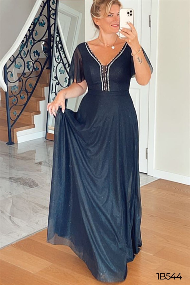 TAŞ İŞLEMELİ SİMLİ ELBİSE OMUZDAN AŞAĞI 155 CM