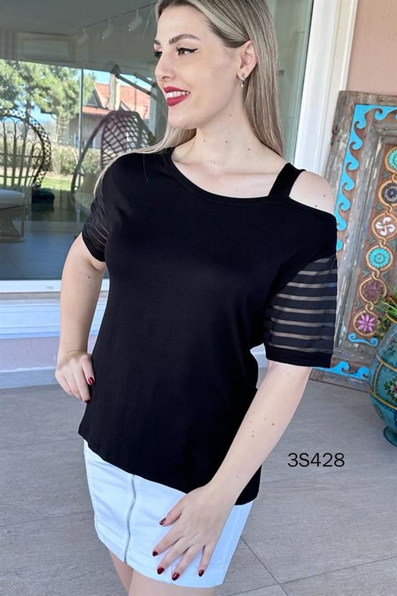 TEK OMUZ DEKOLTE TÜL DETAY BLUZ OMUZDAN AŞAĞI 66 CM