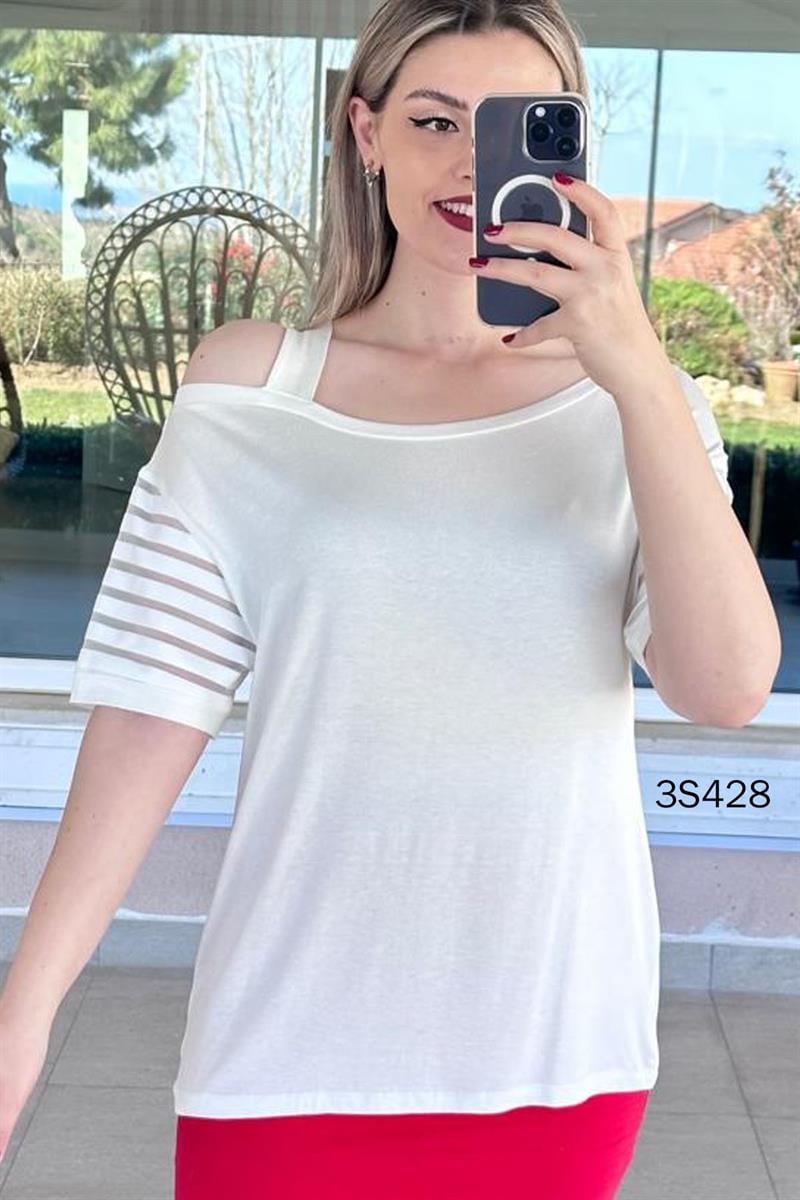 TEK OMUZ DEKOLTE TÜL DETAY BLUZ OMUZDAN AŞAĞI 66 CM