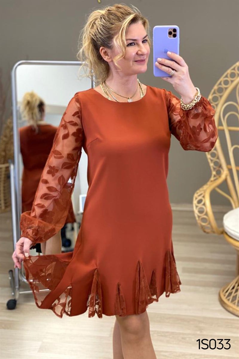 KOL VE ETEK UCU TÜL DETAYLI BİSİKLET YAKA UZUN KOL MİDİ ELBİSE