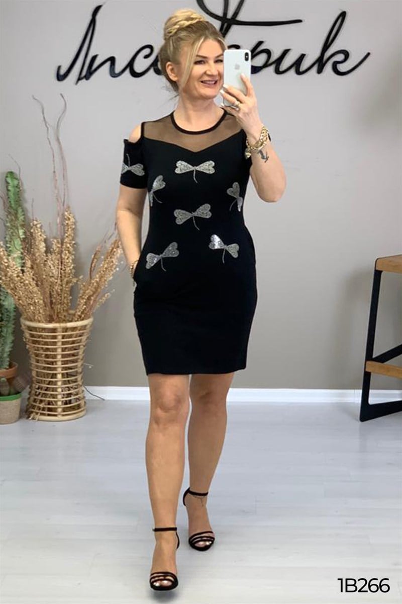 TÜL DETAY KELEBEK TAŞ BASKILI ELBİSE OMUZDAN AŞAĞI 90 CM