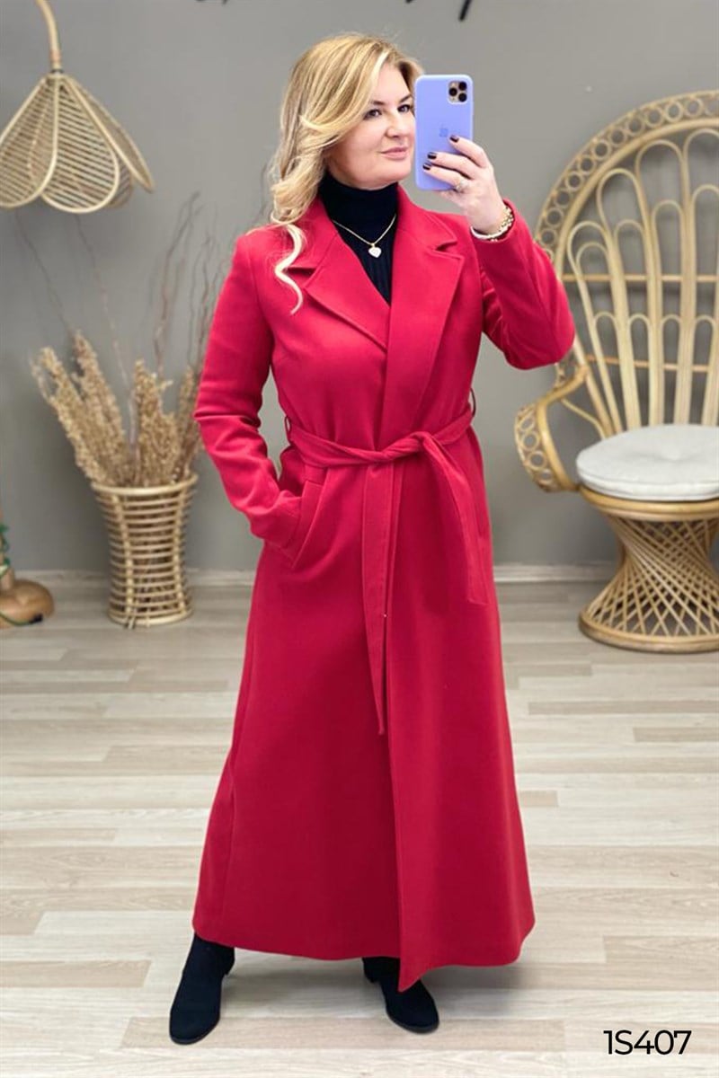 BELDEN BAĞLAMALI YANDAN CEPLİ KAŞE PALTO OMUZDAN AŞAĞI 135 CM