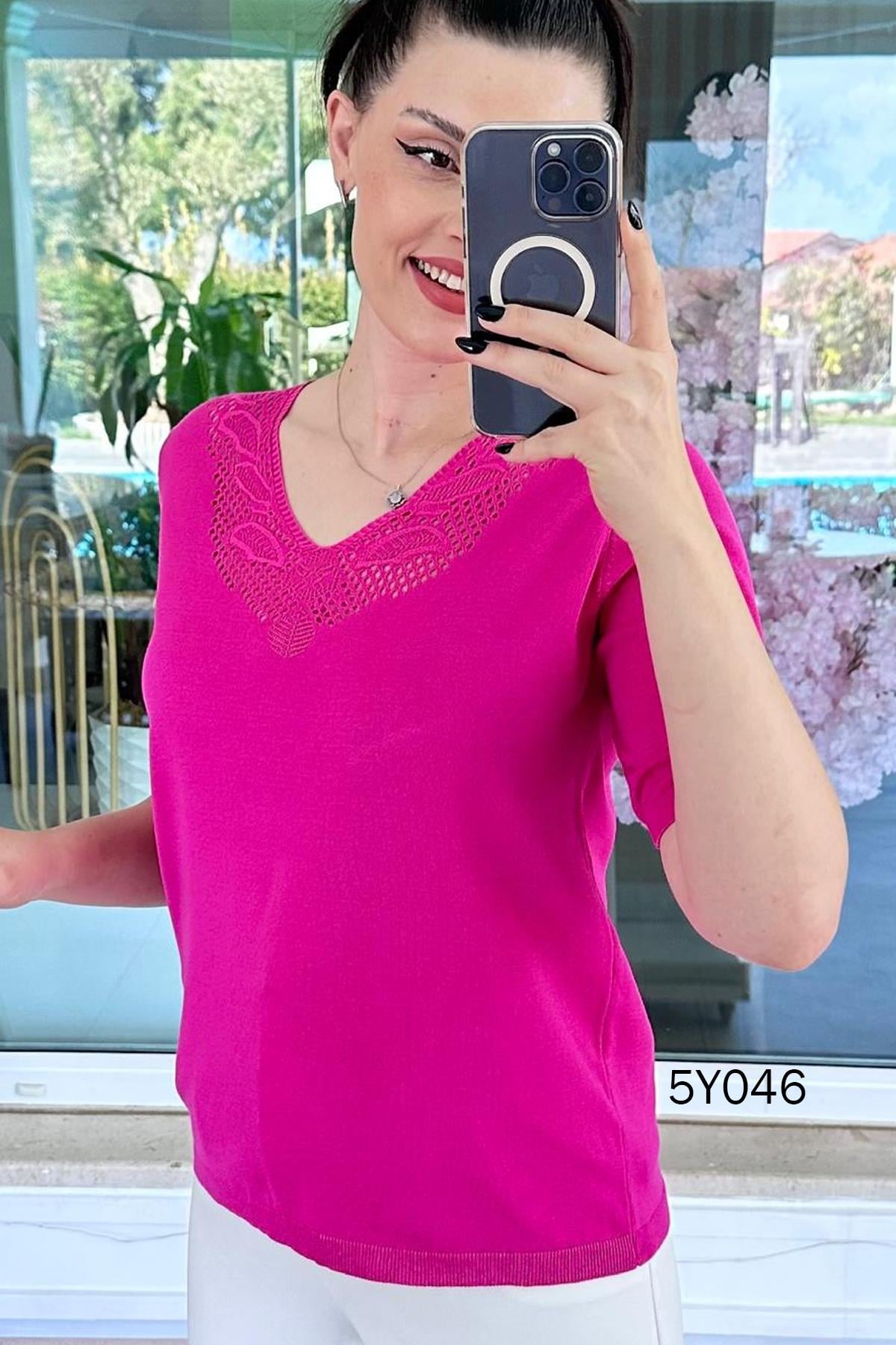 V YAKA AJURLU MERSERİZE TRİKO BLUZ OMUZDAN AŞAĞI 63 CM Ürünümüz trikodur. Full likralı, standart bedendir. 38-46 beden uyumludur.
