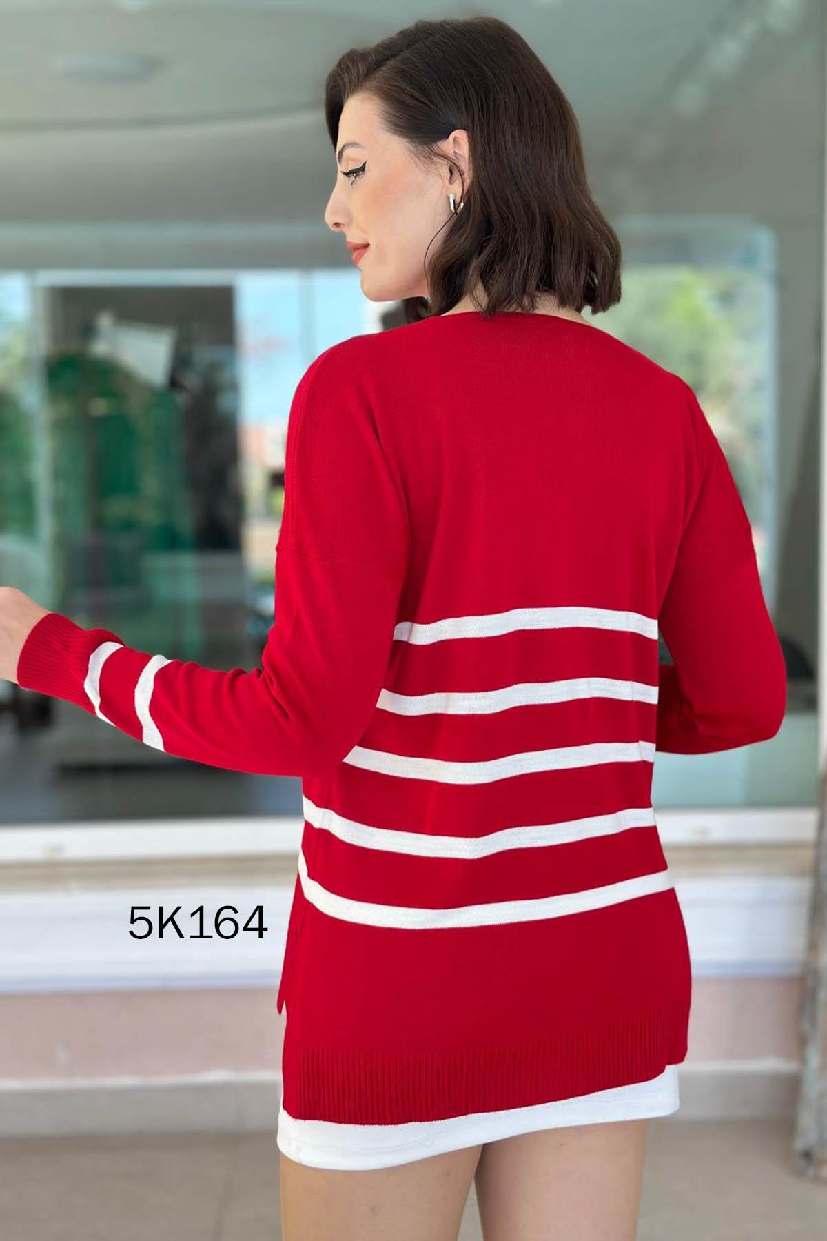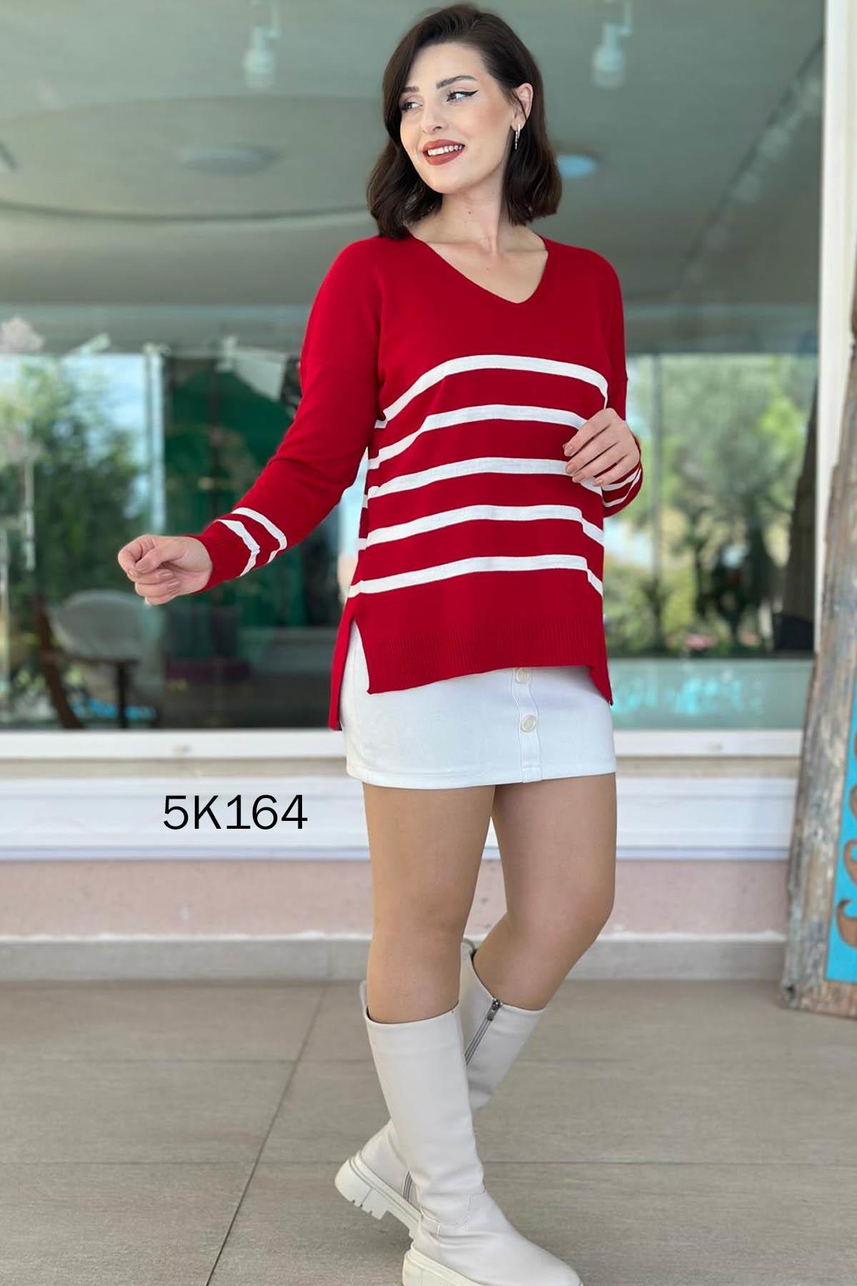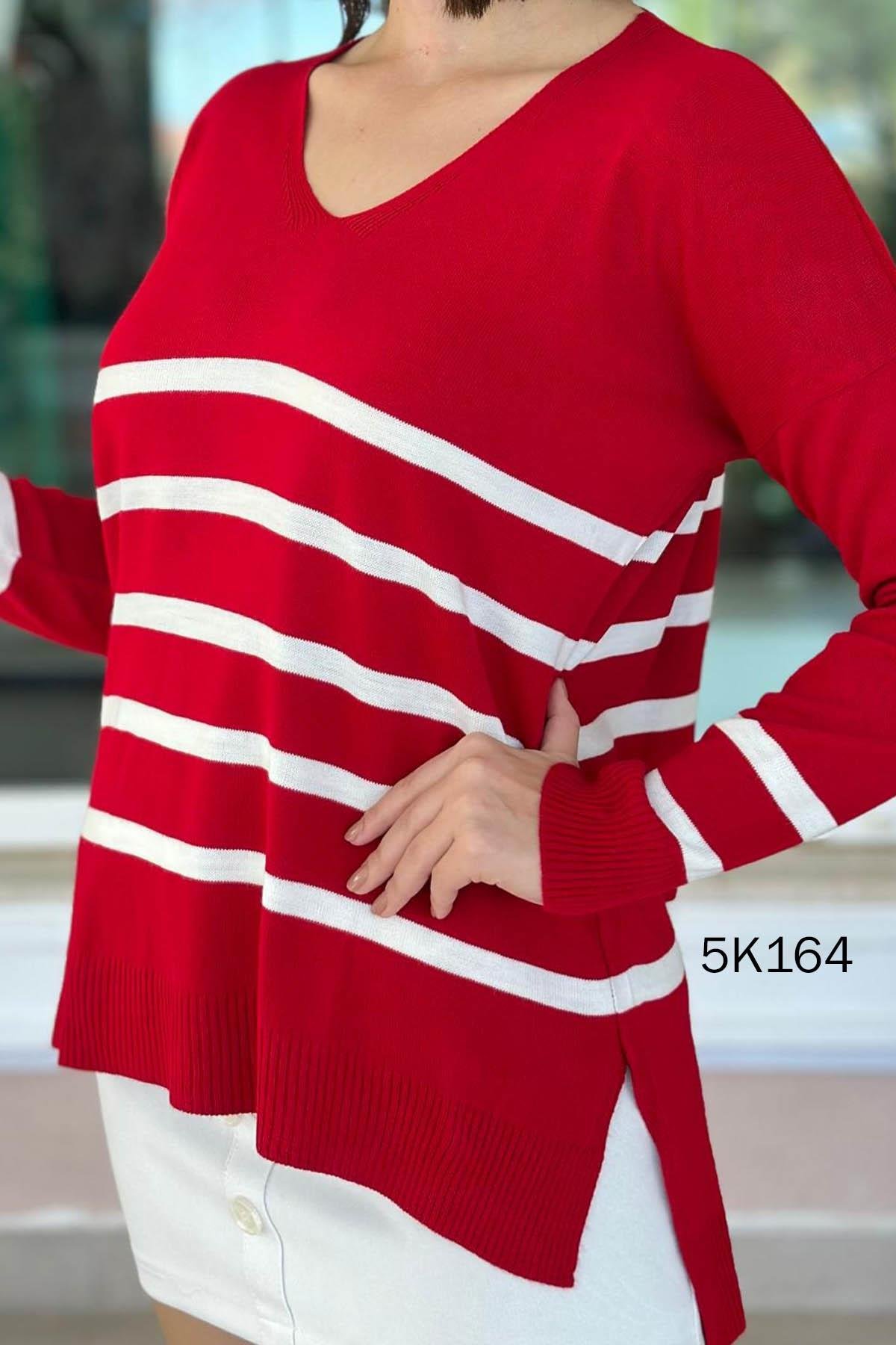 V YAKA ÇİZGİLİ TRİKO BLUZ OMUZDAN AŞAĞI ÖN 64 CM ARKA 68 CM
